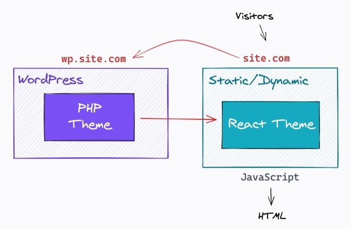 In this mode site visitors access the site using the main domain and are served HTML pages directly from Frontity, and the secondary domain is used by content editors to access the WordPress admin pages. Frontity fetches data from the REST API located on the secondary domain, i.e. the WordPress installation.