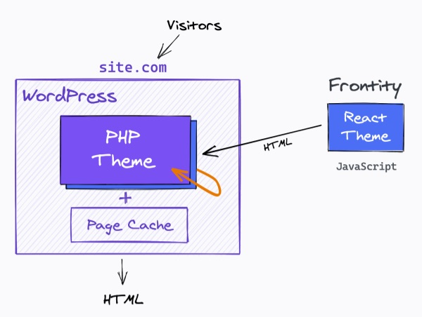 In Frontity projects, WordPress is used as a headless CMS. Frontity uses data from the WP REST-API and generates the final HTML that is displayed in the browser using React. This means that WordPress is merely used for managing the content.