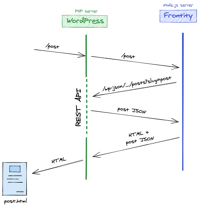 The PHP theme is replaced with an internal HTTP request to the Frontity server.