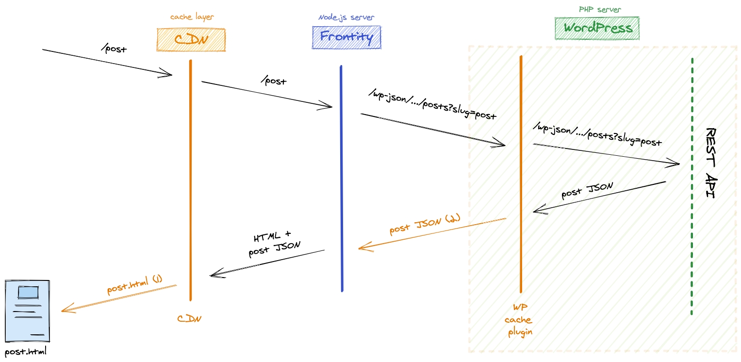 Frontity will fetch the data from the REST API of the WordPress Server and will return the final HTML as an Isomorphic React App.