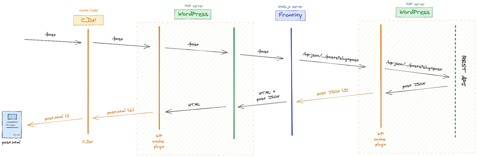 More routing is involved (resulting in potentially slower execution than Decoupled Mode) with the "two stage round trip" (WordPress → Frontity → WP REST API → Frontity → WordPress), so a caching strategy is a necessity rather than simply a nice to have.