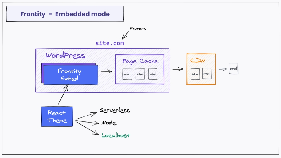 This mode requires the installation, activation and configuration of the Frontity embedded mode plugin to work.
