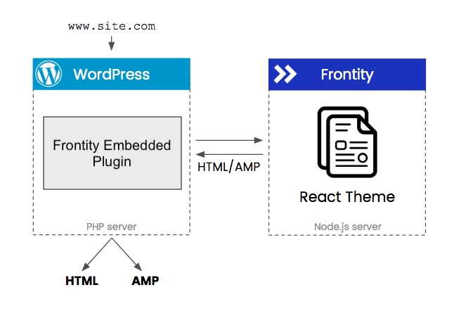 WordPress (via the Frontity Embedded Mode plugin ) will redirect the request to Frontity, which will get the data from the REST API to return the final HTML as an Isomorphic React App that will be returned to the user by WordPress.